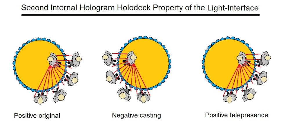 If not a computer-generated internal hologram, such as a person or other furniture of the background scenery, it must first be projected from another " input receiving" Light-Interface, before it can be flipped around and transmitted back out the telepresence Light-Interface where the holodecks of the subject and the object can interact together.
