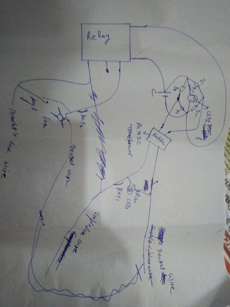 I have invented an electrical circuit which helps to save electricity. Suppose there is a fan in a room operated by inverter supply and a water cooler outside the room connected with simple supply of electricity. As the load of water cooler is high so it is generally not run by invertor supply as compared to the fan. if the air and cooling giving by cooler is enough then we must keep the fan at the off position to save electricity. Suppose power cut happens when we are sleeping then mosquitoes and warming wake up me then I switch on the fan. If electricity comes on before I am asleep then I switch off the fan again to save electricity and same situations repeated during power cuts. if I am sleeping before the electricity comes then I sleep under fan connected with inverter and cooler runs along with the fan when electricity comes. In this situation the fan is useless running. The circuit invented by me runs the cooler and fan when we keep the circuit on night mode. The fan stops when the cooler is running by electricity and the fan automatically runs when the cooler stops during power cut. The fan and cooler runs alternatively during the supply of electricity and power cuts. The fan stops during power supply by saving electricity.