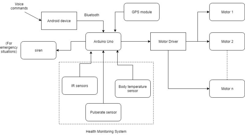 Voice commands can be given through an app installed on the patient’s Android device. The mobile and wheelchair can be connected over Bluetooth using the HC05 Bluetooth module and Arduino Uno microcontroller. The voice instructions of the patient can be decoded and sent as input to Arduino and the motor driver moves the wheels accordingly. If the voice command module doesn’t work properly due to noisy surroundings, the joystick can be used to facilitate movement.