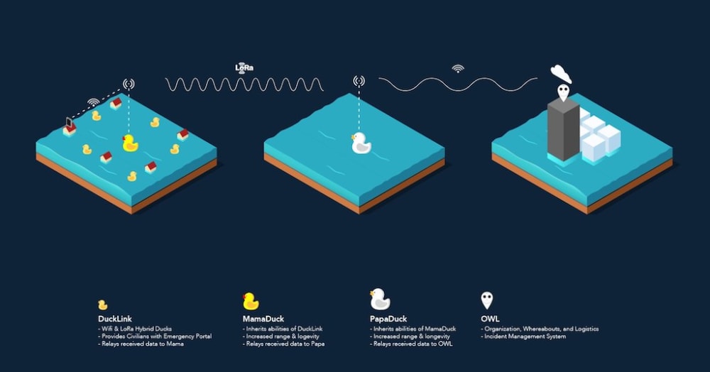 Our IoT hardware solution ClusterDuck addresses this issue. Ducks are miniaturized multi-terrain wifi-enabled devices that are dispersed in clusters in areas where traditional infrastructure and communications is offline.