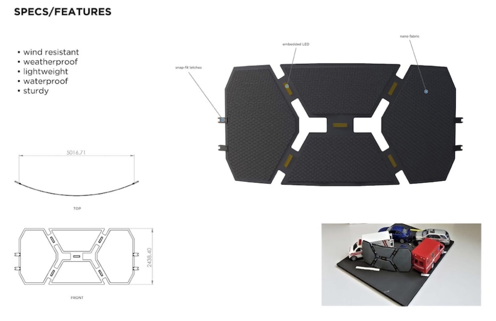 As for structure of the barrier, the curvature of it, allows air flow to travel around and through the device. It also provides discretion for sensitive individuals from seeing a horrific car accident. The barrier would be made of nano fabric that is lightweight yet durable. In addition, a first responder can retrieve the product for an easy setup. After attaching the product to an emergency vehicle, the first responder activates the barrier by a method called "ionoprinting". This method works by sending electric currents through hydrogel embedded in the fabric to stiffen the barrier form.