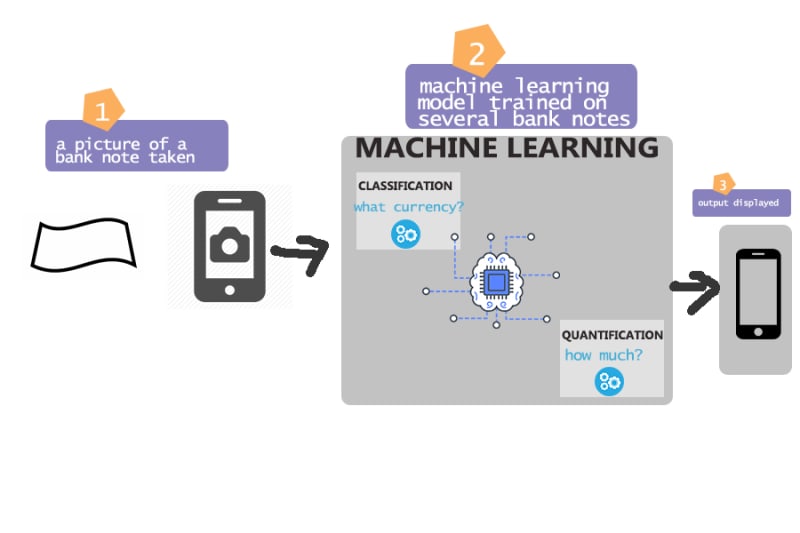 Using computer vision, it gets an image of a bank note and starts to look for the specific features that make that money unique. it then cleans the image data and feeds it to the frozen convolution neural network model that spits out a result. The result is an array of labels which in our case are names of the various bank notes we've trained on and the confidence levels for each. The system will pick out the label with the highest confidence level.