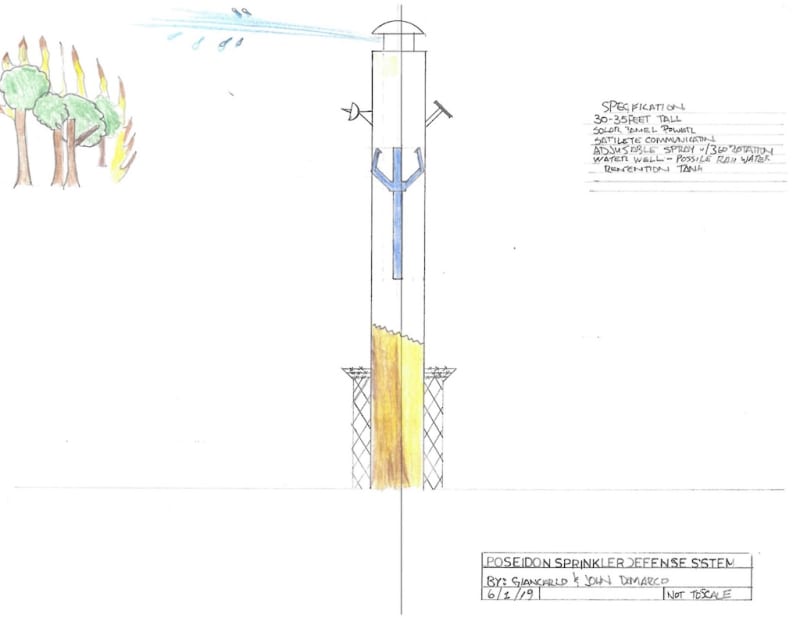 Each unit would be painted to look like a tree so they fit into the natural environment in its standby mode. Enclosed by a 15-foot fence to prevent anyone from tampering with the equipment, when activated PSDS will sound its alarm to warn hikers, campers or animals in the area of fire and the unit is being activated. At full height, PSDS will range from 30-35 feet with 360-degree rotation capability and the spraying ability of up to several hundred feet. The water spray will be adjustable to focus the water on the fire and prevent waste and unnecessary soaking. Satellite technology will be used to monitor and control each unit from a central command center. Power will be provided by an adjustable solar panel on the shaft of each unit.