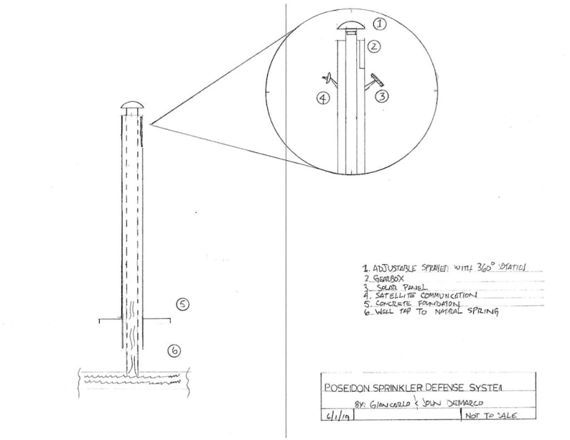 Over the past few years, we have witnessed some of the most destructive forest fires on record. With the increasing threat of climate change, forest fires will start to become more frequent and more deadly. The Poseidon Sprinkler Defense System (PSDS) is the first and only defense needed to stop these destructive fires. Placed in strategic locations throughout the Western United States, in states like California, Arizona, Washington and Colorado, PSDS can be activated remotely upon detection of an incoming forest fires. The construction is primarily of aluminum, cast iron, copper, plastic, stainless steel, and steel alloys. A gearbox will be seated near the head of the unit will control the stream and water PSI.