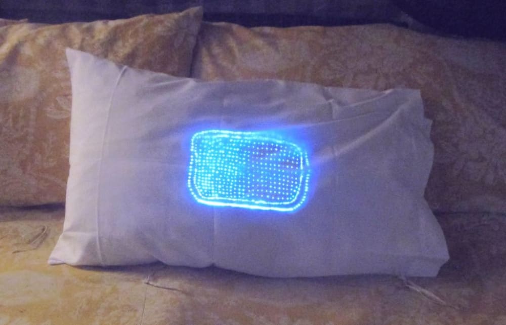 A pillow embedded with PMMA medical grade optical fibers by a CNC machine I invented back in 1997. I coated the surface of the fabric with a thin film of silicon forming a flexible substrate underneath the pillow case so that a grid of light is formed over the surface. I use an Opti-Coupler I invented last year that responds to WIFI and Bluetooth commands from smart phones to generate light frequencies from IR to UV and pulse UV at 40 Hz through the fibers using a AA size 3.7 VDC Lithium Ion battery. You cannot feel or see any indication of any tech in the pillow until activated. The radiation helps to cure Psoriasis, Eczema, Acne, and some forms of skin cancer. The Opti-Coupler can also emit rainbow slow changing light patterns to sooth autistic children via smart phone commands and another Opti-coupler globe is able to emit sounds like rain, wind, music or other soothing sounds to help sleep disorders. The tiny (2" X 1") Opti-Coupler can be removed from the pillow and plugged into a pair of pants that help to relieve leg cramps, and sooth aches and pains. Remove it from the matching coupler attached to PMMA fibers installed in the pants and plug it into a wristband to focus UV radiation to help relieve carpel tunnel syndrome, remove it and plug it into an insole, slip it into a shoe to relieve pain.