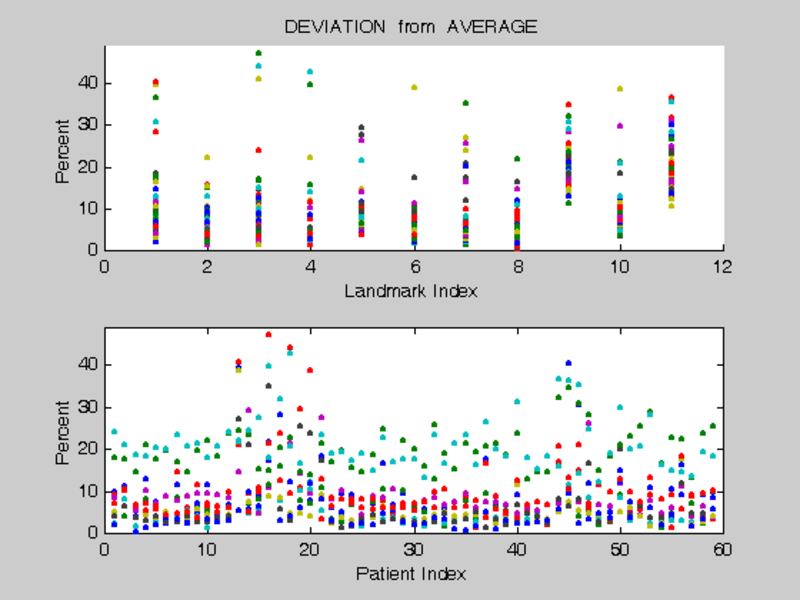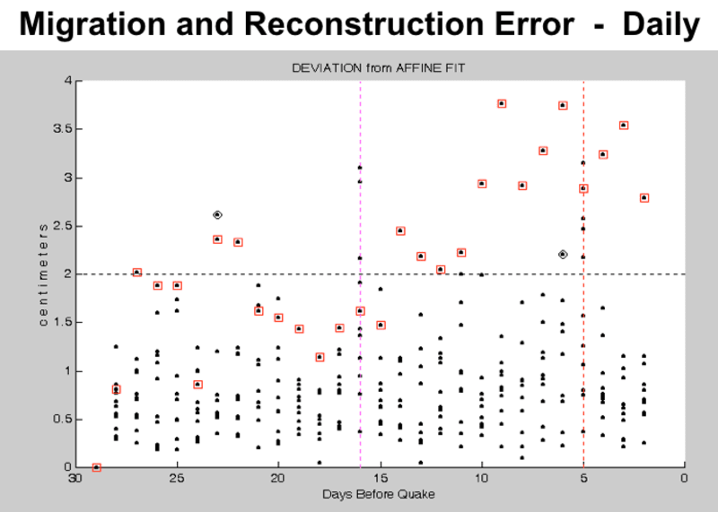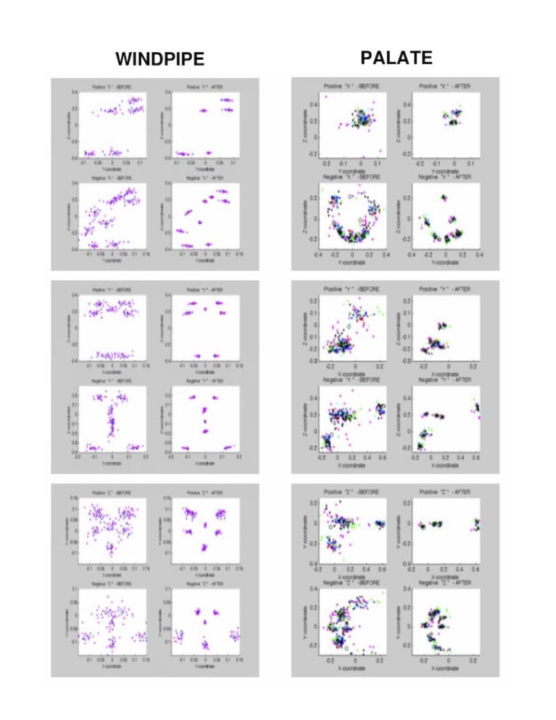 Excerpts from https://www.ion.org/publications/abstract.cfm?articleID=15257 show windpipe and palate landmark views before and after extracting computed deformations; convergence is quite evident. That first visual illustration is followed by a second, with a plot of deviations-from-average for all patients vs landmark index, and for all landmarks vs patient index. The last visual illustration indicates beyond-dispersion model deviations FIVE DAYS before the Tohoku quake ONLY on pre-shock days or at the station nearest epicenter.