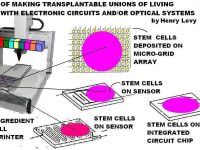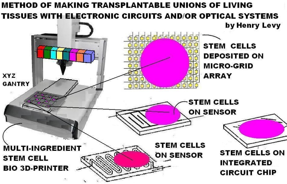 Ordinary cells and stem cells are deposited upon, grown, attached to, united, and coupled with non-rejectable electronic circuits, sensors, radio tranceivers, optical, electro-optical, and/or computer systems, to form new transplantable unions. Cells are 3D-printed, deposited, dipensed, painted, sprayed, air-brushed, injected, squirted, spritzed, or delivered by other means upon circuits, or optical systems.