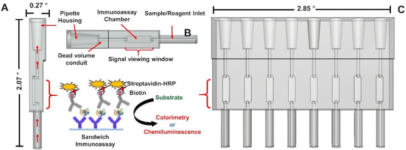 Tips were designed as a microfluidic adapter that can be either singles that fit single-channel pipettes or eight chambers that fit multi-channel pipettes. Each chamber capacity is 50 uL and have an overflow conduit to protect pipettes from contamination.