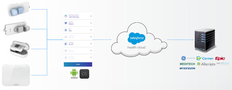 The VitalDetect, GlucoseDetect, and VitalWeight transmit the readings via Bluetooth to the Vital App (Android/iOS) which provides an intuitive guide through the workflow. The results from the Vital App are automatically stored to the Vital Cloud powered by Salesforce Health Cloud and can be reviewed remotely by the patients’ healthcare provider or concerned family member. The Vital App graphically tracks and shows trends of physiological vital signs. In the future, the Vital App will also include a virtual health coach which will be able to provide the patient with the interpretation of the results which will drive behavior.