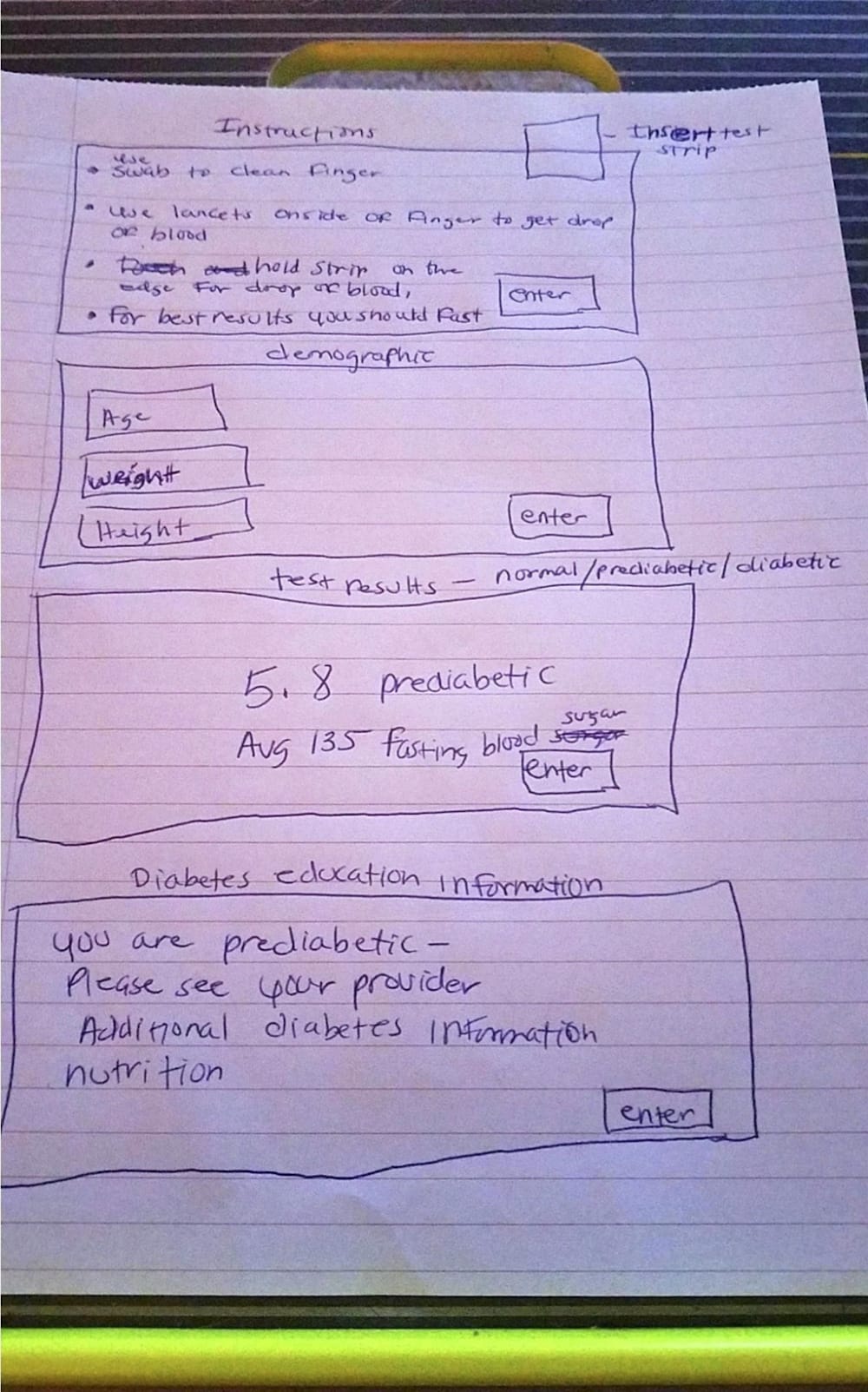 My idea will make people aware of their blood glucose numbers to see if your numbers are high or within the normal range. The Diabetes kiosk will have a touch screen asking several questions such as age, weight, and height. The Diabetes test on the go kiosk will sell sterile packet which consists of one test strip and one lancet and alcohol swab to clean finger Diabetes on the go will advise the patient to contact their primary care provider. Diabetes on the go will provide education material and allow anyone to email the results to their email address or to a primary care provider. Diabetes test on the Go will provide cleaning instructions after ever visit and a maintenance contract.
