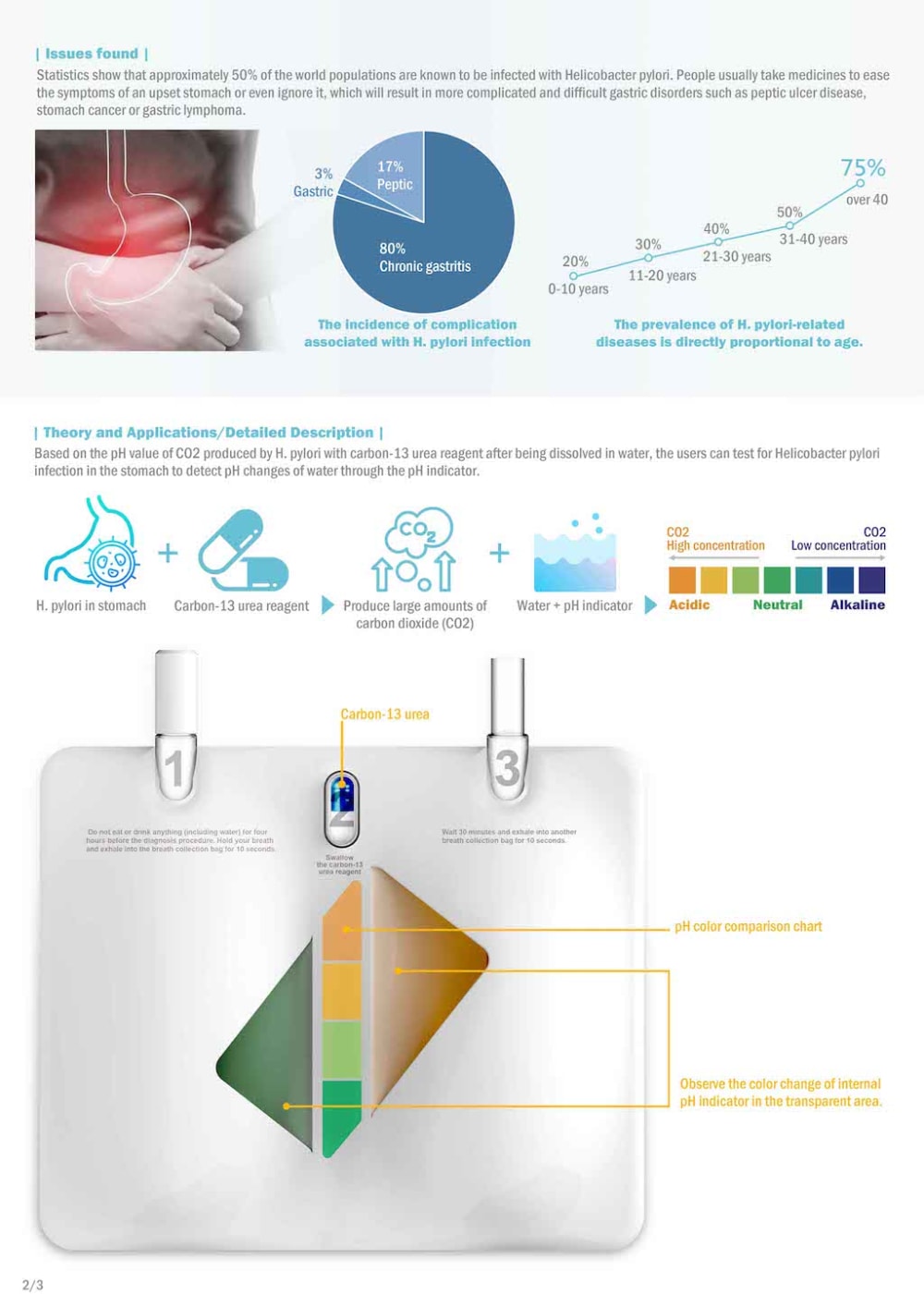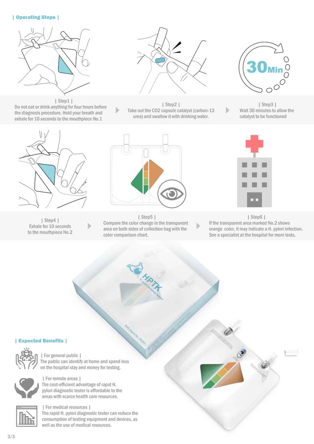 HPTK is a medical kit to detect H. pylori infection. Based on the pH value of CO2 produced by H. pylori with carbon-13 urea reagent after dissolved in water, the users exhale into right/left HPTK breath collection bags, record the color changes of pH indicator before and after swallowing the reagent to compare with the universal color chart. If big difference occurs, further test is required. HPTK can prevent stomach disorders and reduce the consumption of medical resources.