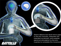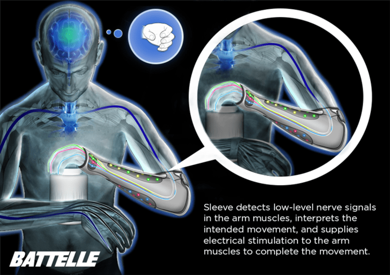 Battelle’s “Create the Future” invention solves these issues by creating a sleeve that is self-contained, can be worn virtually anywhere, and will translate the wearer’s thought about a movement into the actual movement in real-time, even when the brain-to-hand messaging is weak or garbled. When the wearer thinks about a movement, the sleeve detects very low-level nerve signals in the arm muscles using electromyography or EMG. These signals are interpreted by algorithms to identify the specific movement that the wearer intended to make, and translated into the correct, specific pattern of functional electrical stimulation that, when delivered to the arm muscles by electrodes in the sleeve, will cause the muscles to complete the intended movement. This allows the wearer to make natural movements of their choosing in real time, meaning they can complete more activities for normal living, independently. Battelle’s Create the Future invention is immediately assistive, and benefits the wearer from its very first use by reducing the need for outside assistance with normal activities. Its use also strengthens muscles in the forearm, to reverse atrophy and ease painful cramping. Perhaps most important, its use longer term helps the brain rewire stroke-damaged nerve signals to the hand through a process called “neuroplasticity.” This ultimately leads to recovery of more natural, unassisted hand function over time, making it an invaluable tool for physical rehabilitation for stroke patients striving to live a normal, independent life again.