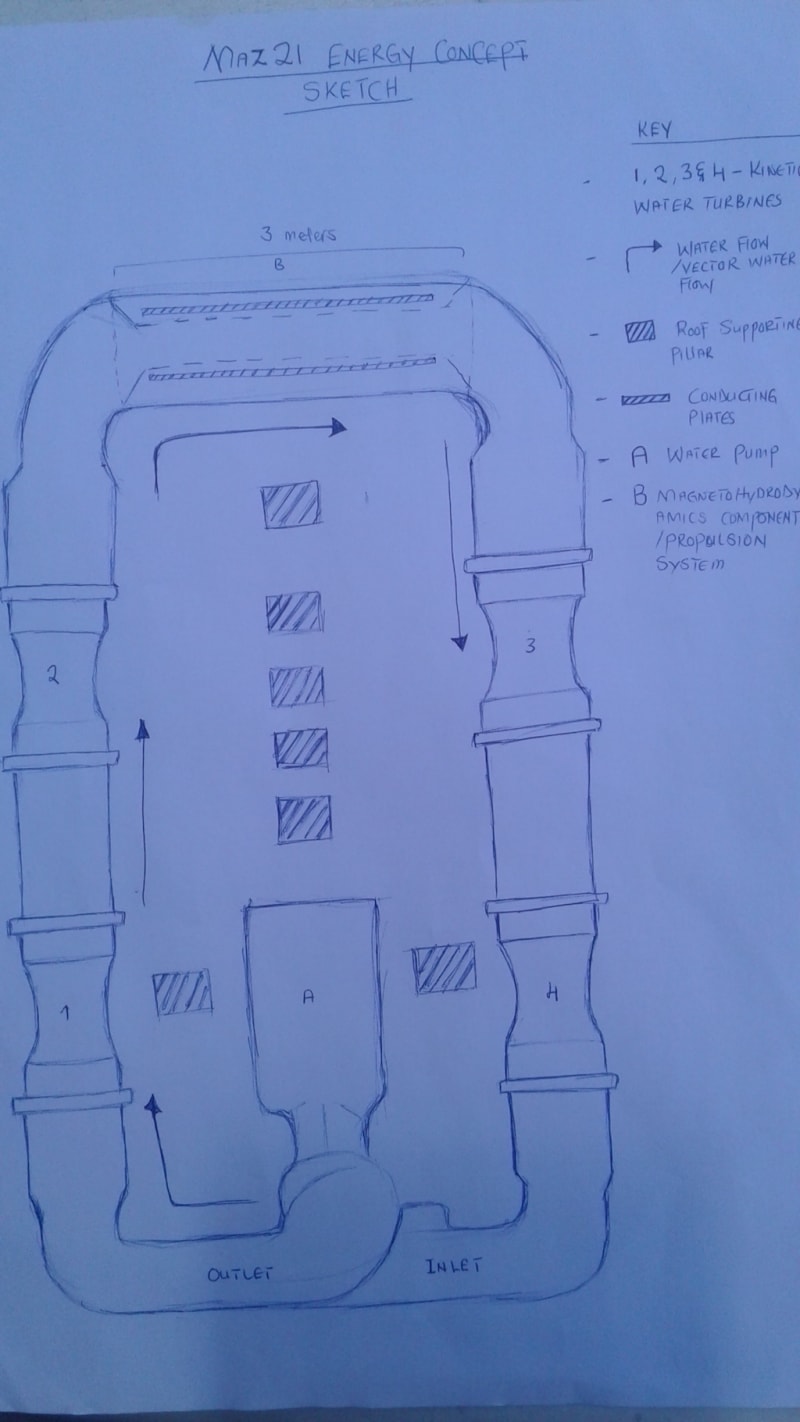 The Maz21 energy concept evolved from the water web concept of 2018 (https://www.entrepreneurship-campus.org/ideas/16/10791/). It seeks to generate power in a cost effective way. It utilizes kinetic water turbines fixed in a series inside a 80cm internal diameter polyethylene tube. The whole system will have 4 kinetic water turbines which shall be connected to form a complete cycle. The water shall flow inside the tubes by a force from the Magnito-hydro dynamics propulsion units, designed and inserted in the tubes.