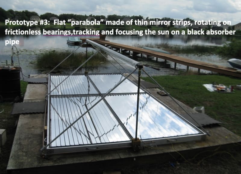 1) Thin mirrors in our solar concentrator panel (1.5 X 3.5 meters) track the sun from dawn to dusk, focusing the sunlight onto a black absorber pipe that discharges heat-transfer fluid @ 400°F. "Sunfunnel", like a glass pup-tent, is novel in low cost, self-cleaning, needs no maintenance, and offers an operating life of 4 decades. Each panel supplies some 3 kW of heat; one may use dozens of such panels, depending on the power need... and roof area.