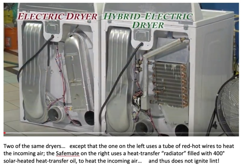 2) Our clothes dryer is powered by the solar-heated fluid through an air heat exchanger. It is unique in two ways: 1) uses little power: being the first dryer to receive Energy Star rating. It dries clothes quickly, with half the conventional dryer energy BTUs. 2) it does not start fires. (!) 2010 data: some 15,400 home dryer-fires resulted in 51 deaths, 380 injuries and $236 million property damage. Without red-hot wires, our "SafeMate" dryer does not have any internal temperature approaching lint ignition.