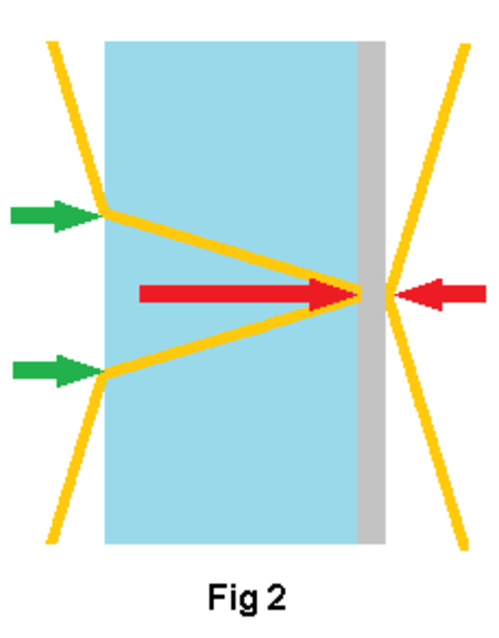 Refer to Fig. 2; these refraction forces are shown by the green arrows in Fig. 2. Entry-forces and exit-forces are both exerted toward the refractive material but in the same direction since the photon enters and exits the same side of the refractive material. The refraction forces act in the same direction as the net reflection force which is implied by the two red arrows.
