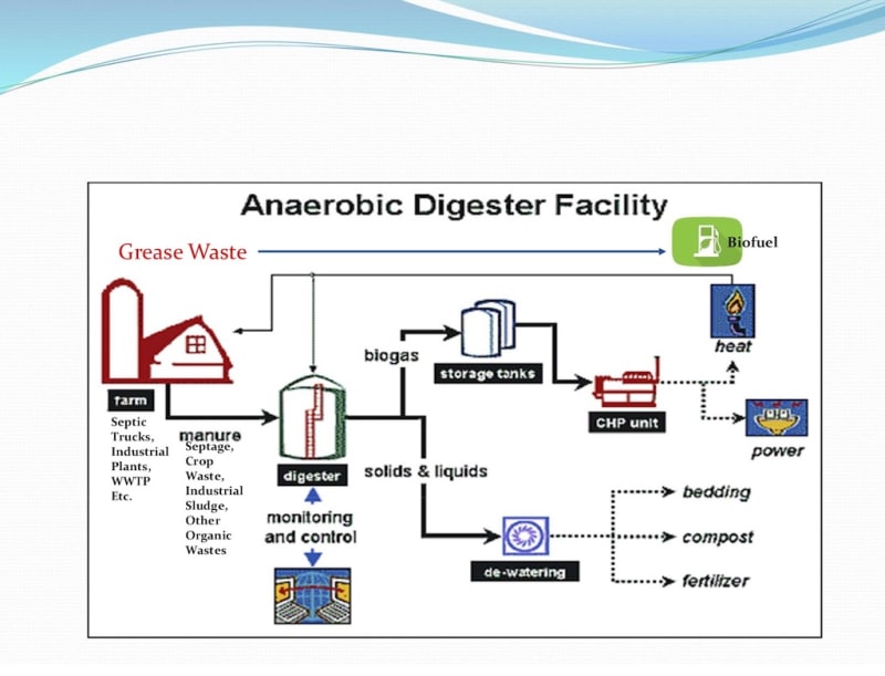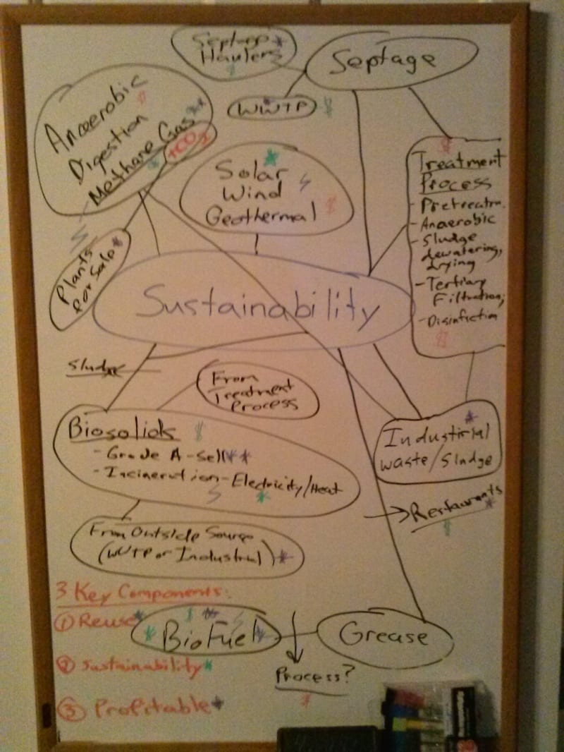This innovation of this idea is not the individual technologies or processes but the culmination of the system to be self-sustaining and profit oriented all on otherwise wasted materials. The system would utilize the byproducts of the treatment of the incoming waste to power the system and the remaining would be sold for a profit. Any additional energy required would come from green technologies such as solar, wind, and geothermal. Profit would also be made through fees for accepting the waste (from septic haulers, municipalities, restaurants (for grease), any industries that need to dispose of organic waste, etc.).