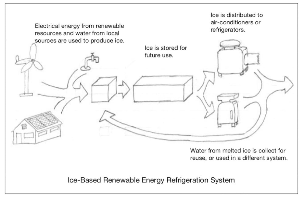 An ice-based renewable energy refrigeration system would need to consist of a series of devices to include an energy producer, water source, ice maker, ice storage, ice-based refrigerator or air conditioner, and water collector. Water and ice storage would be scaled to need. A family-sized system would be small enough for a house or apartment. Larger ice makers and storage systems would be used for larger industrial buildings, such as a server farm. Transportation and distribution of the ice, which can be very heavy, would likely be local. A family-sized system could produce 10 kilogram blocks; an easy lift. An industrial-sized system could produce larger blocks, which would be moved by machinery. The system could be designed to reuse melted water, either to produce more ice or for use in another system.