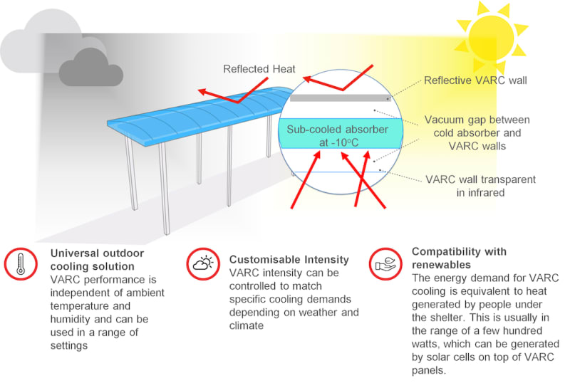 One practical application can be outdoor shelters, walkways and awnings. They are primarily designed to shield pedestrians from sunlight and rain. On hot days, these shelters provide shade and prevent heat gain from sunlight. However, they are unable to help pedestrians cool down by losing heat to the environment. Shelters constructed with VARC panels will be able to provide standard shielding from sun and rain with added advantage of a cooling effect similar to that of an air-conditioned room (depending on geometry and VARC temperature).