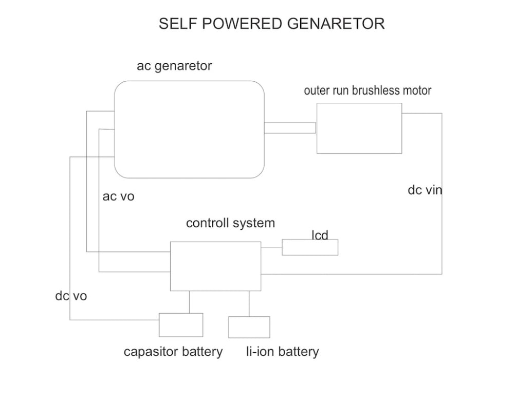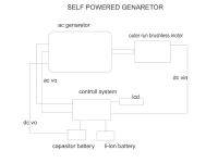 This self powered generator is based on the energy cycle from electrical to mechanical and back to electrical. This generator will use a brushless motor, esc, capacitor battery, li-ion battery, arduino and 240v 2kva alternator.