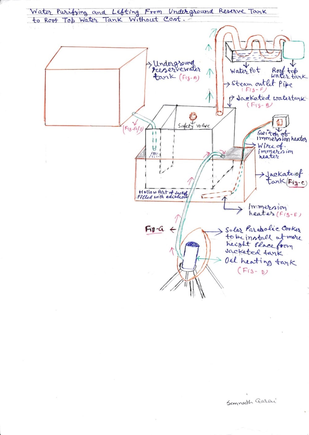 For this system, a metal water tank (Fig -B) to be installed at some down position of the underground reserve water tank. A metal jacket to be fitted at middle position of side of this tank by keeping some gap at all side and bottom ( please see fig -C ). A pipe to be fitted from the side wall’s bottom position of reserve tank to this tank's top position (fig –A/1). A solar parabolic cooker to be install at more height position from this tank at any place or roof top. A metal tank to be install with this solar parabolic cooker ( please see fig-D ) and a pipe line to be fitted at this tank’s lower side position, and end position of this pipe will enter into the top of hollow position of new installed jacketed tank (fig-G). One or more immersion heater to be kept among the hollow place of jacketed tank (fig -E ) and switch of the heater to be fitted at the wall of ground floor. A steam out let pipe (Fig-F) to be fitted from this jacketed tank to roof top water tank and before entering to this tank the steam carrier pipe will go through a water pot (near roof top water tank).