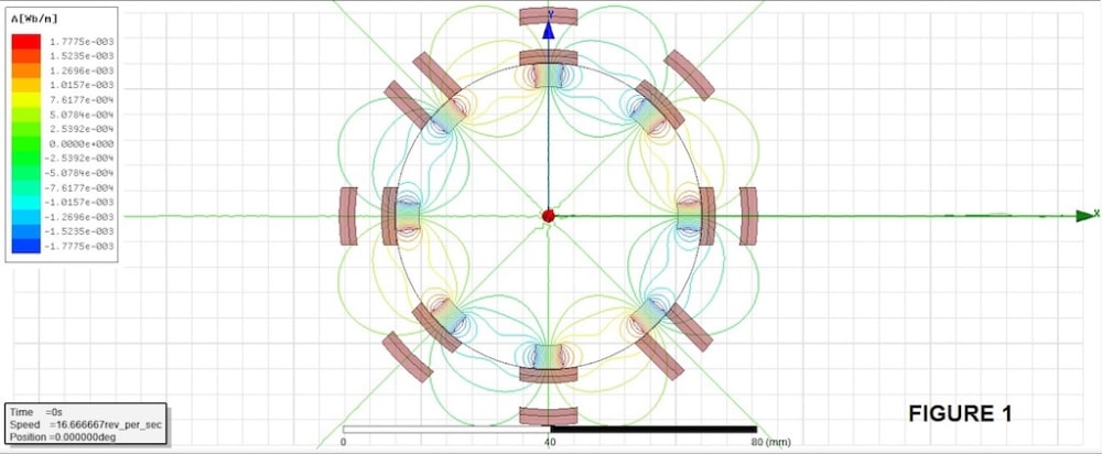 With reference to FIGURE 1, the IMG consists primarily of a rotor and a stator. The rotor includes a plurality of permanent magnets fixedly mounted to a shaft (not shown) for rotation therewith. As shown, the magnets are arranged in attraction mode relative to one another, their magnetic axes being parallel to a radial line.