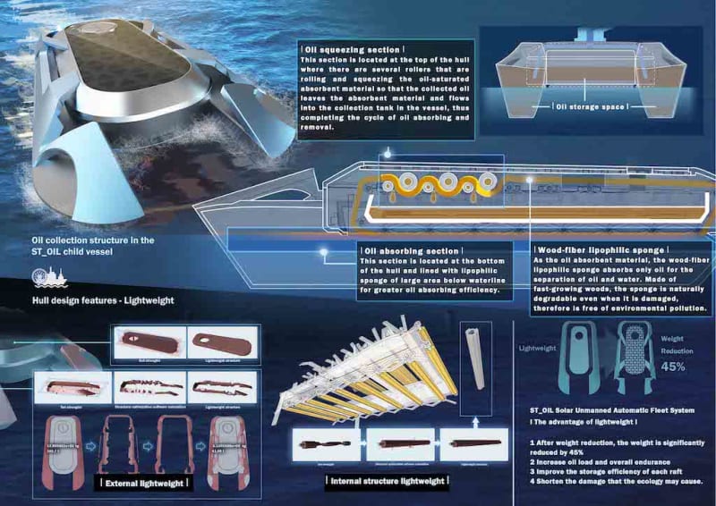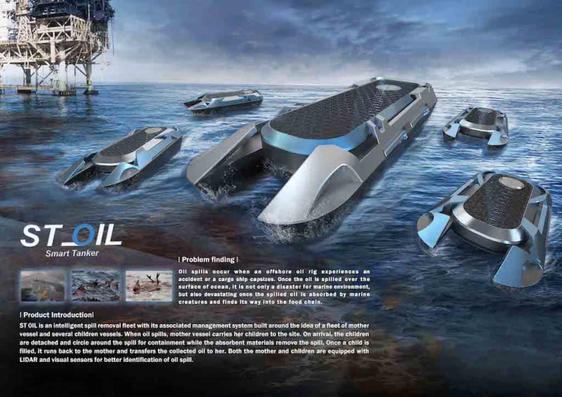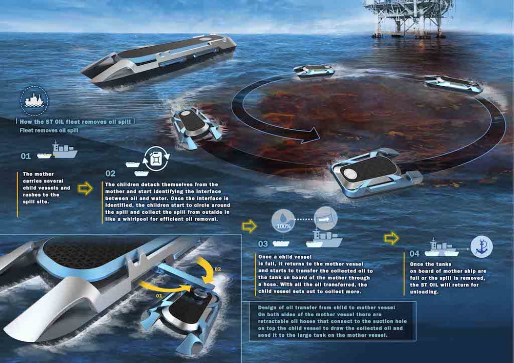 ST 0IL is an intelligent spill removal fleet with its associated management system built around the idea of a fleet of mother vessel and several children vessels. When oil spills, mother vessel carries her children to the site. On arrival, the children are detached and circle around the spill for containment while the absorbent materials remove the spill. Once a child is filled, it runs back to the mother and transfers the collected oil to her. Both the mother and children are equipped with LIDAR and visual sensors for better identification of oil spill.