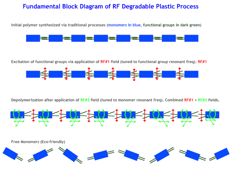 A method for designing a plastic that is comprised of RF sensitive monomers whereby they can react with specifically tuned RF fields to de-polymerize thus converting the polymer into its monomer components.