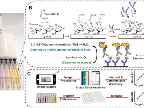 We introduce a low-cost pipette tip-based ELISA platform “ELISA in a Tip” as a next generation assay tool with lower cost, better sensitivity, shorter time, low sample and reagent volumes than traditional ELISA. Our platform could serve as a simple microfluidic adaptor that encourages to blend microfluidic advancement,