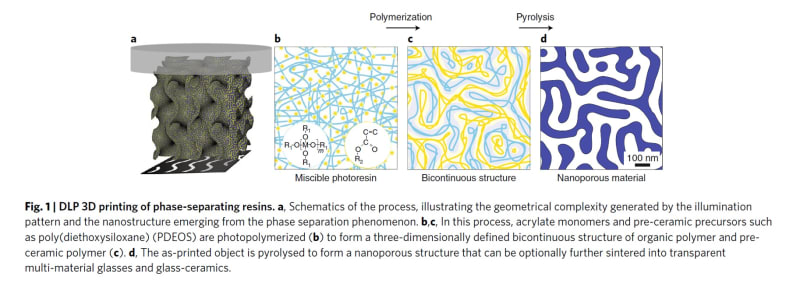 Because polymerization-induced phase separation is a universal physical process, we envision this technology to be also applicable to a broad range of chemical compositions and additive processes (for example, ink-jet). In analogy to the well-established sol-gel chemistry, a rich variety of inorganic precursors can be potentially structured into porous or dense glasses and glass-ceramics using this additive manufacturing technique.
