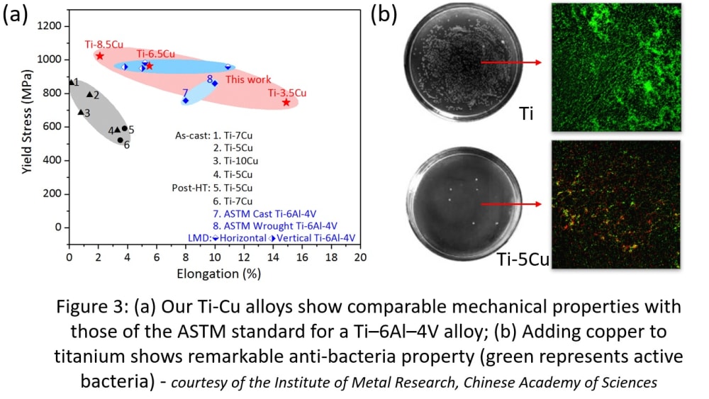 Titanium-copper alloys are one option, but there are also a number of other alloying elements that are likely to have similar effects. It could kickstart a new range of high-performance titanium alloys for medical device (e.g. implants, dental applications), defence (e.g. armors) and aerospace applications (e.g. engine blades, structural parts). Moreover, the new breed of alloys could increase manufacturers’ production rates and allow for more complex parts to be manufactured.