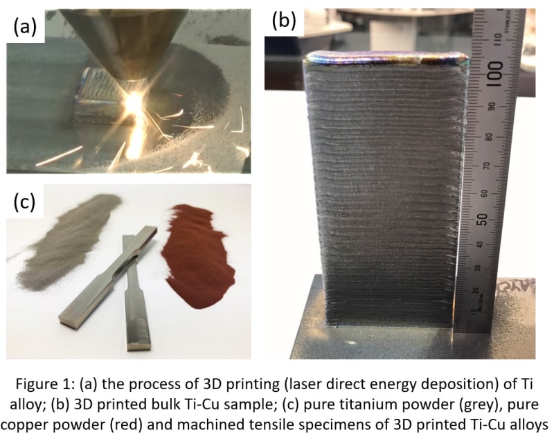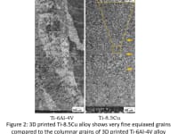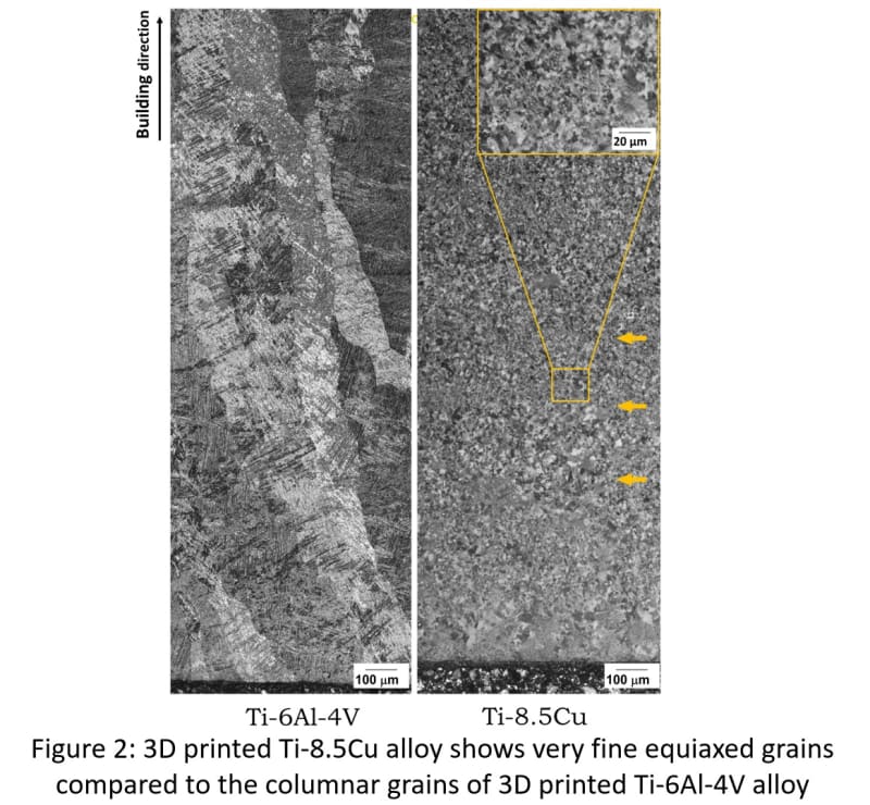 To solve this problem, we designed a new class of alloys (i.e. titanium-copper alloys) with high strength and optimum solidification behaviour for AM. The 3D printed titanium-copper alloys have fully equiaxed grain structure: this means the crystal grains had grown equally in all directions to form a strong bond, instead of in columns, which can lead to weak points liable to cracking. Additionally, our titanium–copper alloys printed with exceptional mechanical properties (e.g. strength and ductility) without any special process control or additional treatment.