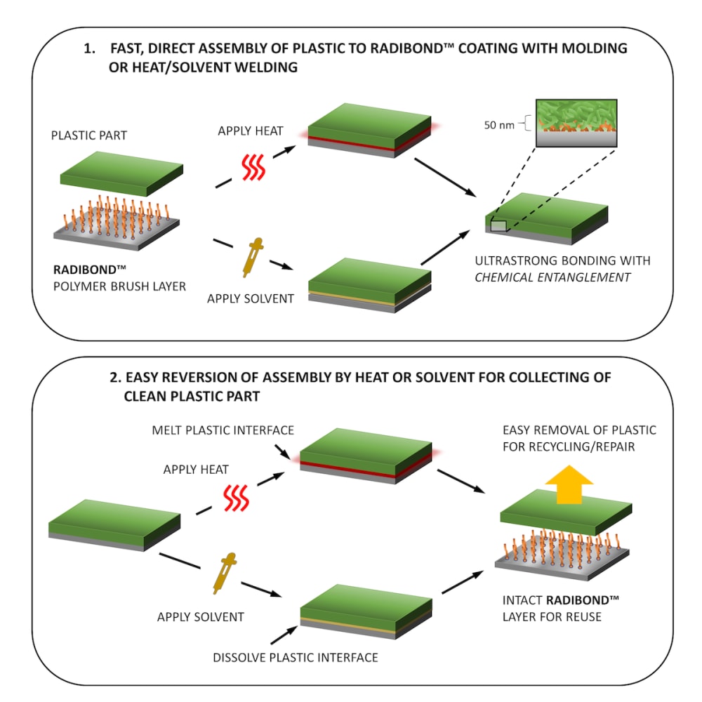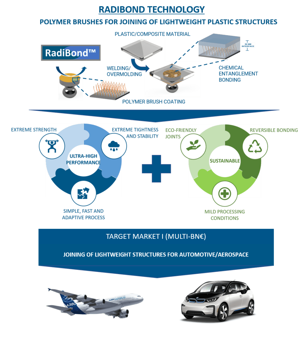 To solve this challenge, RadiSurf has developed and patented the groundbreaking RadiBond technology, based on nanometer-thin coatings of polymer brushes, that provide ultra-strong and ultra-tight bonding between metals and the challenging plastic or plastic composites typically used for automotive and aerospace. RadiBond is a sustainable bonding technology that can also easily be reversed at product end-of-life for disassembly and recycling of the bonded parts.