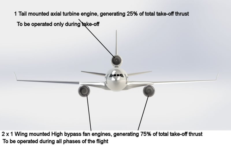 New power plant should be designed to use two high bypass fan turbine engines that would utilize all energy from turbine to drive high bypass fan only (something like turbo-prop engine). Thrust developed by these two engines should be the thrust required during cruise portion of the flight. Third engine should be installed in the tail (like DC10/Tri-star), which will generate thrust by the expanding exhaust gas from turbine engine (to reduce overall diameter of engine). Third engine thrust should be enough for aircraft take off when augmented by thrust of two high bypass fan turbine engines.