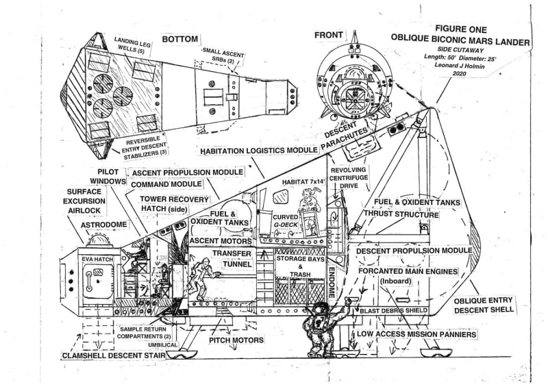 Lands horizontally, oblique stacked cone design (FIGURE ONE) positions Airlock, Descent Stair, Mission Panniers and Sample Return Compartments near ground: Straight underside; uniform ground height from nose to base.