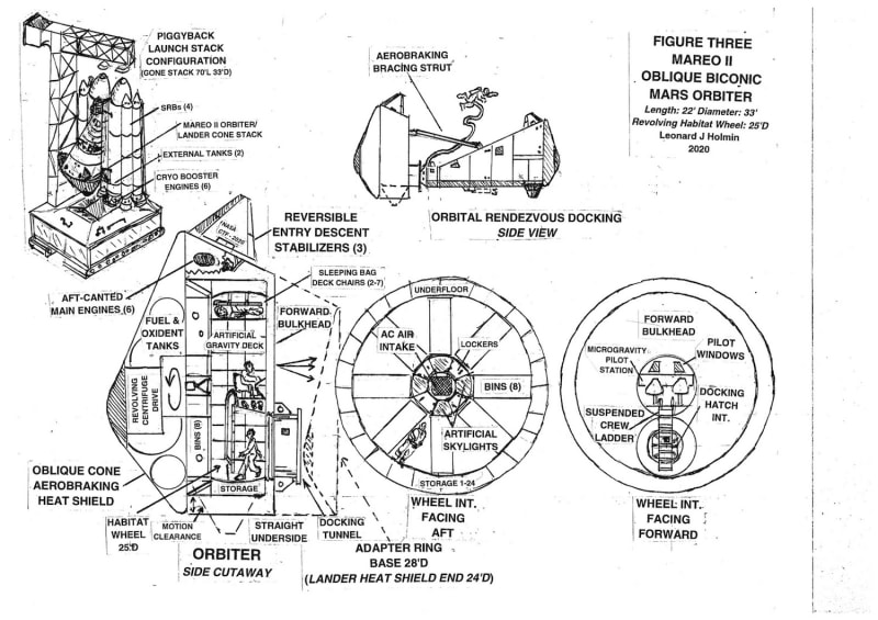 Enters Mars orbit via MAREO II Orbiter (FIGURE THREE; Holmin CTF 2017, 2018). Cone stack launches piggyback atop twin external tanks, six cryo engines, four SRBs. Comprises 33'D base block; aeroshell; stabilizers; aft-canted main engines; adapter ring jettisoning for orbital rendezvous docking; aerobraking bracing strut; revolving wheel habitat; underdeck storage; bins; sleeping bag deck chairs; microgravity pilot station; artificial skylights.
