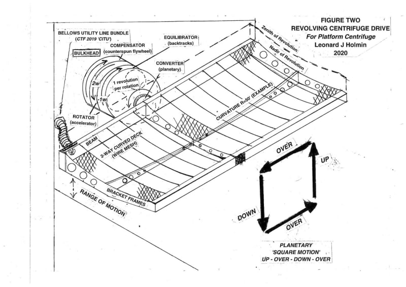Upper level has a Platform Centrifuge (FIGURE TWO) comprising a suspended deck (wire mesh), 2-way curved as if a segment of a larger wheel (eg, R=50'). Deck stays oriented, using planetary or 'square motion', up, over, down, over (doesn't rotate). It revolves between its zenith and nadir points, within a limited range of motion, much like a children's mechanical horse ride (Hahs 1932). Features a flush treadmill, exercise area and gravity-aided toilet.