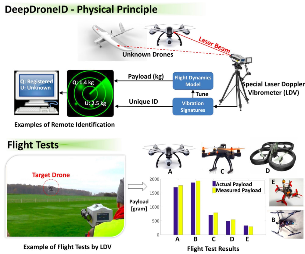 DeepDroneID is an innovative system for remote identification and payload monitoring of standard and modified drones. DeepDroneID is based on measuring vibration noises, measured by a long-range laser vibrometer, of any drone as a unique signature for remotely verifying registered specifications. This signature is compared to a pre-stored database of registered drones in order to identify a drone’s manufacturer and any unauthorized internal modifications to registered specifications such as payload capacity. DeepDroneID is also able to measure the payload capacity of unknown drones based on their motion performance and their instantaneous vibration noises. Flight tests have been successfully conducted for a group of standard and modified drones by the Institute of Flight Systems, DLR (German Aerospace Center) in Germany.