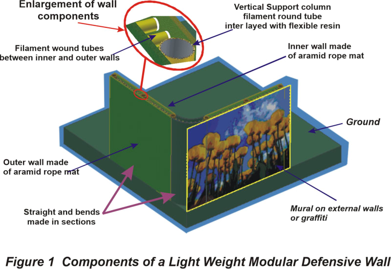 A defensive wall concept has been schemed that has a thickness of 400mm. it is modular (hence easily repairable) and it is constructed in a mixture of engineering composite materials (Kevlar re-inforced plastic, GRP and CFRP). These materials are formed into three purpose-designed energy-absorbing components and are assembled into a 5 metre high wall. The wall height selected for the initial concept was fairly arbitrary and can be tailored to meet the operational needs of fortifications requirements.