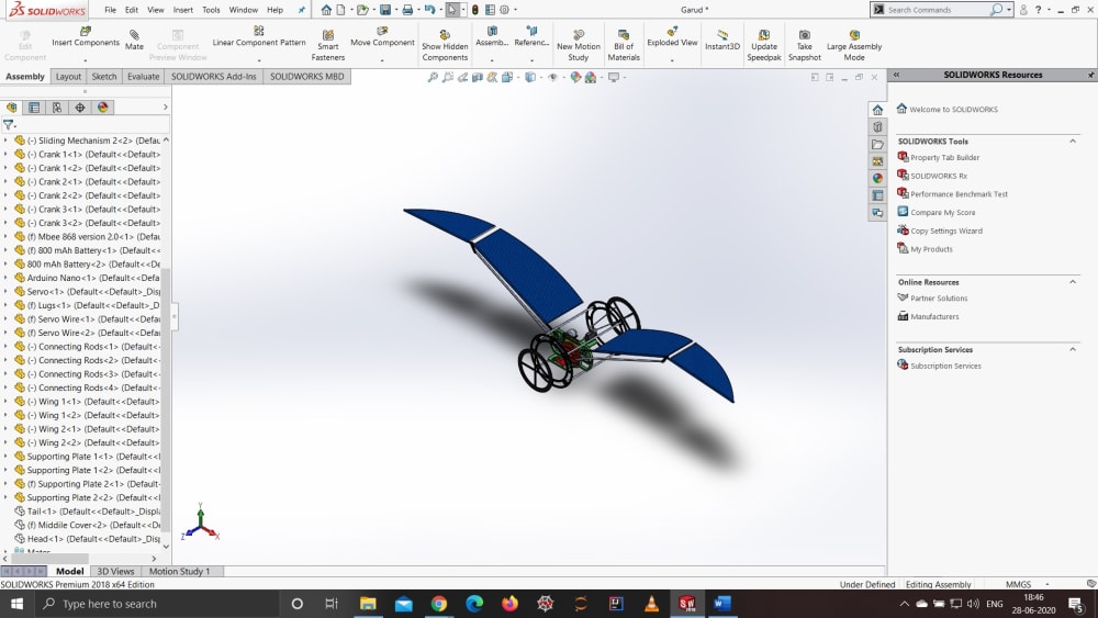 The objective is to design a drone which resembles a bird, also called ornithopter. This drone can be mounted with a camera that can be used for aerial surveillance and photography. Used for military purposes such as aerial recon without alerting the enemies since the ornithopter fairly resembles an actual bird. Several ornithopters have been flown with cameras on board, some of which can hover and maneuver in small places. These ornithopters can be used for spying. At airports, sometimes birds fly into the engines of airplanes causing catastrophic damage. This could be prevented by employing ornithopters to scare away birds, and also, a sound emitter can be used to produce a particular frequency to keep away the birds.It can be used in wildlife surveying and bird surveying. It can be used to observe birds, mammals, amphibians, reptiles, and other invertebrates using aerial surveillance. Using an ornithopter is advantageous for bird surveying as the birds will think of it as one of their own. It can be used to monitor traffic by flying the ornithopters at junctions, traffic signals etc. We will use Lipo Batteries, servo, receiver, brushless motor, camera, frequency emitter(optional), and lightweight carbon fibre structure, with extruded polyurethane foam to build the ornithopter. The final result will be an outcome of an Ornithopter (an aircraft that flies by flapping its wings).