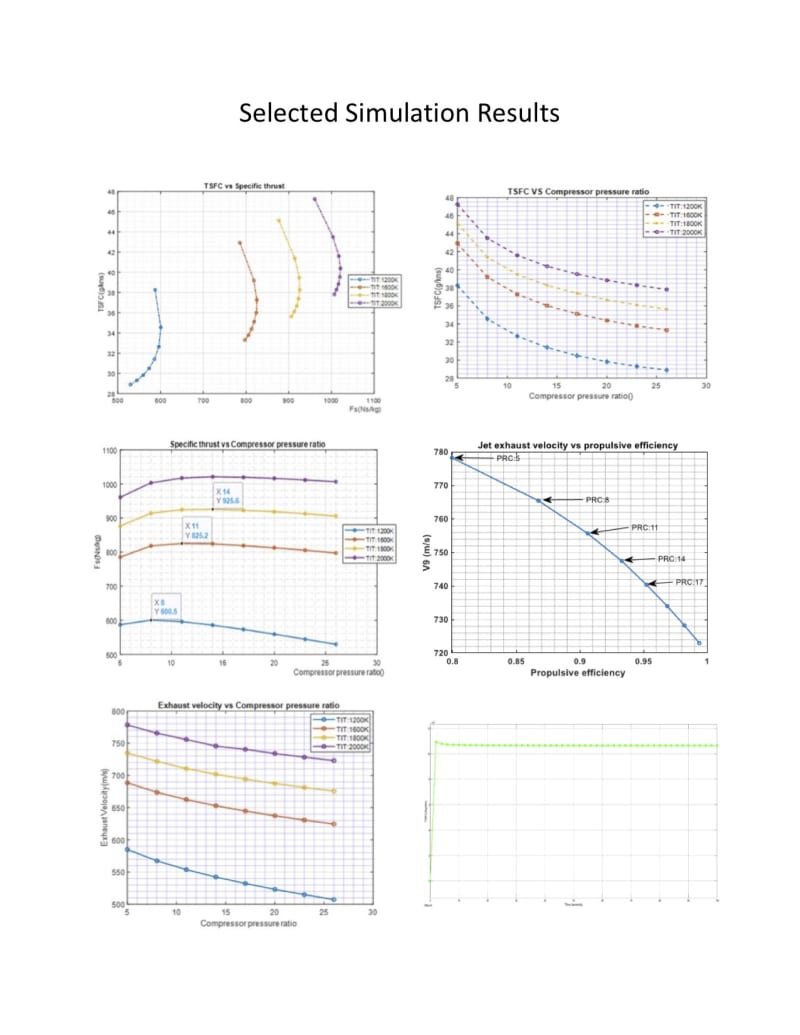 The example of this simulation software can be used to investigate the relationship of the thrust specific fuel consumption vs the compressor pressure ratio, TSFC with the specific thrust and the specific thrust with the compressor pressure ration when the gas turbine engine is operating at different condition such as the turbine inlet temperature variation and different flight altitude.