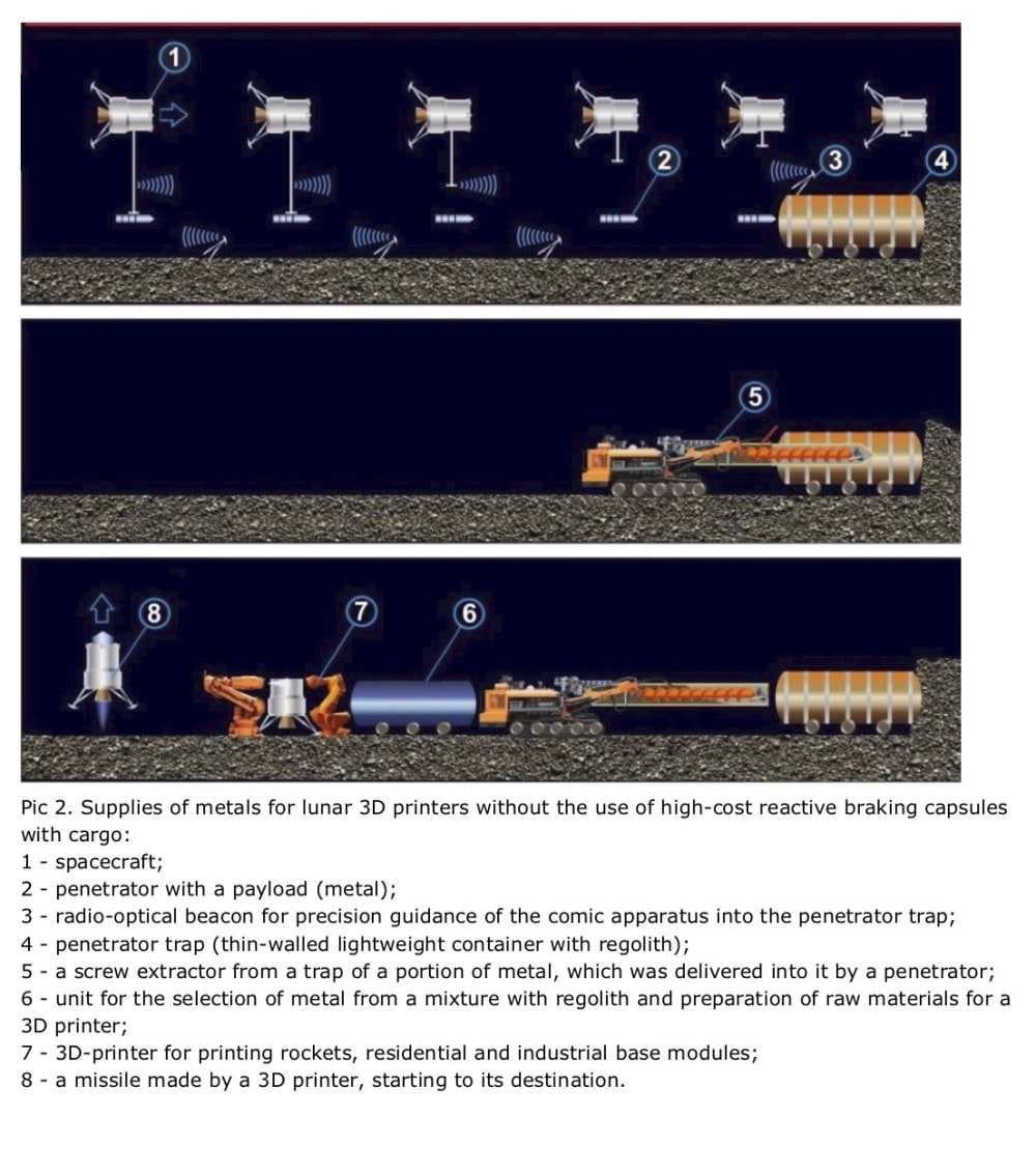 The MoonTrap system is a trap for high-speed penetrators - capsules with a load in the form of very elongated cylinders. A trap is placed on the surface of the moon. It is a lightweight thin-walled cylindrical container filled with a brake medium with a large mass. Penetrators are dropped from spacecraft passing over the lunar surface and then returning to Earth orbit. CubeSat analogues may be used. The moon trap is similar to laboratory traps that are used to capture penetrators entering it at a speed of about 2500 m / s. Metal penetrators, when braking in a trap, scatter into a dusty substance, which is easy to remove from the trap and then get raw materials from it for 3D printing.