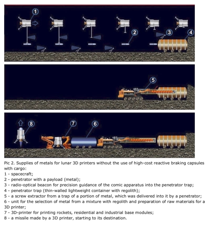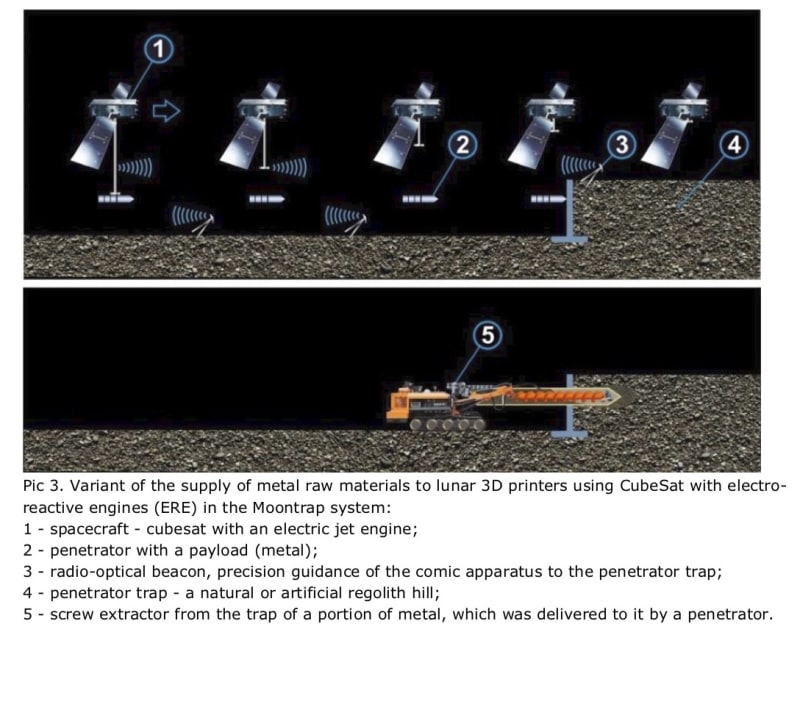 The MoonTrap system is a trap for high-speed penetrators - capsules with a load in the form of very elongated cylinders. A trap is placed on the surface of the moon. It is a lightweight thin-walled cylindrical container filled with a brake medium with a large mass. Penetrators are dropped from spacecraft passing over the lunar surface and then returning to Earth orbit. CubeSat analogues may be used. The moon trap is similar to laboratory traps that are used to capture penetrators entering it at a speed of about 2500 m / s. Metal penetrators, when braking in a trap, scatter into a dusty substance, which is easy to remove from the trap and then get raw materials from it for 3D printing.