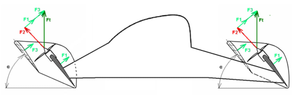 The new propulsion system with a double biplane wing structure uses a thrust augmenter configuration to increase the lift in both vertical and forward flight as is shown in the second picture. In static conditions and at slow speed, the lift capacity increases as a result of higher circulation around the wings, improving the thrust/weight ratio characteristic of the aircraft. Consequently the weight is balanced by the sum of the thrust produced by the propeller and the lift produced by the wings. Because each front wing of each thrust unit is placed in the inlet region of the propeller it will develop a certain amount of lift due to the pressure difference between the wings’ lower and upper surfaces. On the lower surface, the pressure will be equal to the atmospheric pressure, while on the upper surface, the pressure will be slightly lower. As in the case of the front wing, because each rear wing of each thrust unit is placed in the outlet region of the propeller it will develop a certain amount of lift as well due to the increased pressure exercised on the lower surface of the rear wing.