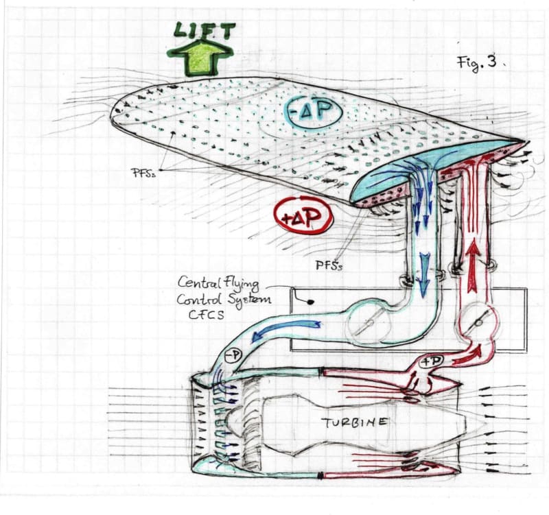 The outer skin of these chambers has evenly distributed nozzles called Pressure Flow Actuators (PFA), strategically located on both sides of any wing or surface of the fixed-wing aircraft. These PFA are the Pressure Vectors that actively generate the pressure forces (negative or positive) to control lift, and/or flight control surfaces, exactly where desired and needed. Figure 3.