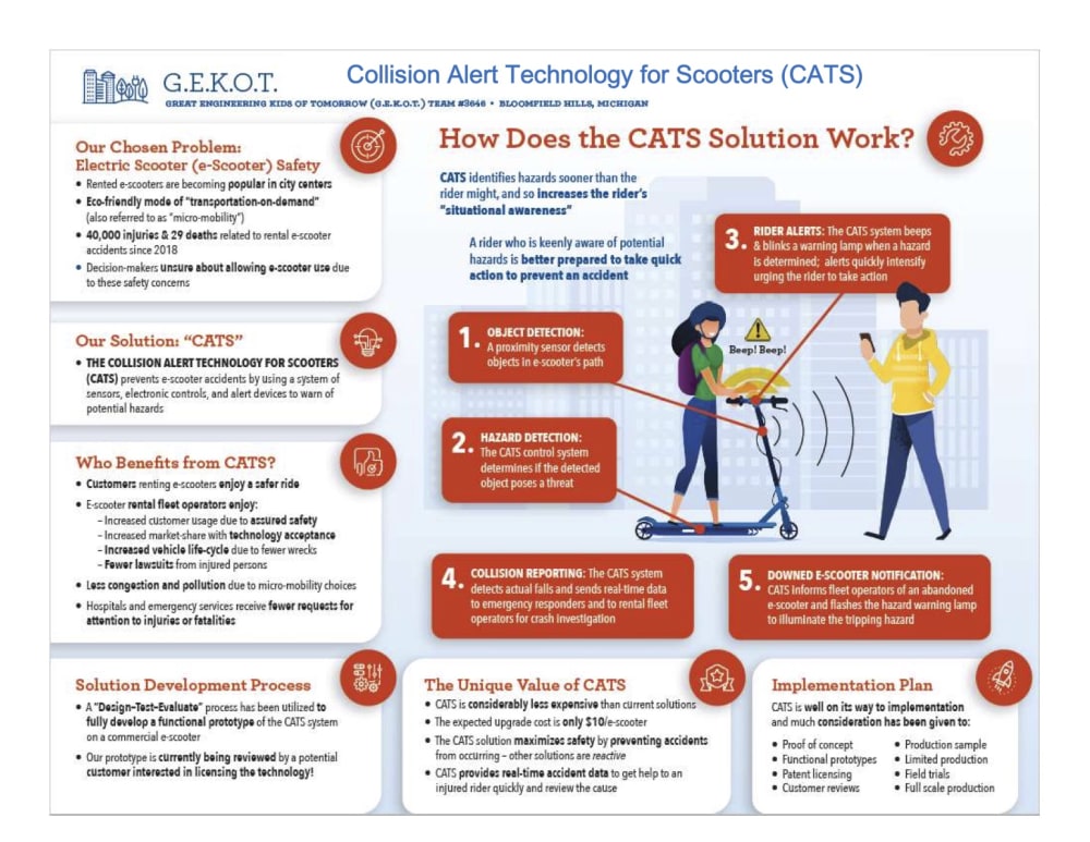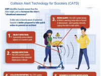 The Collision Alert Technology for Scooters (CATS) is an “active safety” solution integrated into rental electric scooters. CATS uses sensors and controls to detect potential hazards in the path of the e-scooter. CATS then alerts the e-scooter rider of such hazards so that they can take action to avoid a collision. The CATS solution identifies hazards like cars, pedestrians, and bikes (as e-scooters are used on roads, sidewalks, and bike lanes). CATS uses off-the-shelf technology and can be integrated into any rental e-scooter.