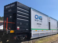 The CNGmotive tenders are designed to transport compressed natural gas (CNG) for use in supplying energy alternate fuel locomotives to which it is coupled. Compressed natural gas is stored in impact and fire resistant pressure vessels that are secured and enclosed within an armored tender structure.