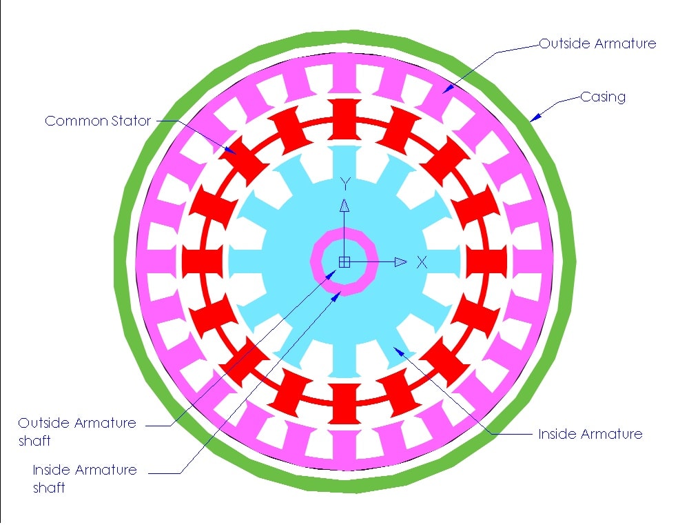 In this concept one armature is inside the stator as in normal motor but another armature is on outside the stator. Stator winding is common for both armature windings. Inside armature act as alternator and outside armature act as motor for normal operation. Flux path is continuous from inside armature to stator to outside armature. Shafts of both armatures are concentric. Details of concept are given in the figure below.