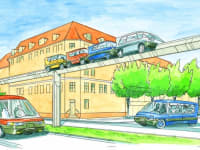 Public Transport will become high status! Night trains based upon maxi-ruf with a sleeping cabine can bring you a long distance during night, so that you can avoid short distance flights and avoid a lot of CO2 emissions. Goods vehicles can use the RUF monorail network. Vehicles can climb steep due to the special drive system which makes it possible to press against both sides of the top of the monorail and obtain the friction you need for climbing a steep slope.