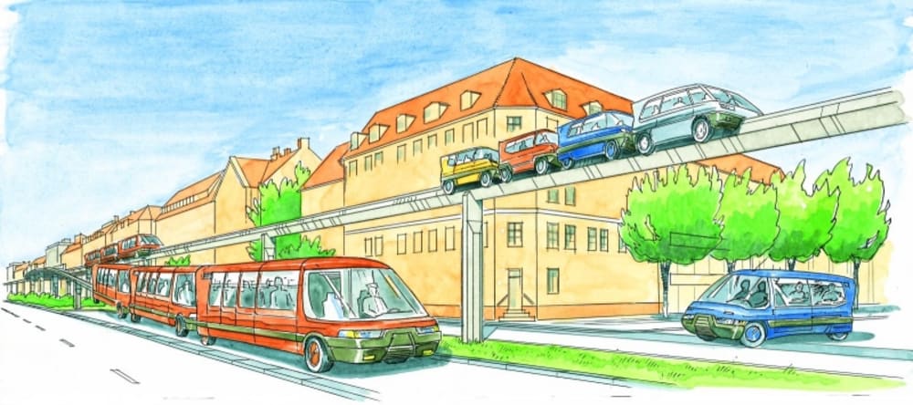 It can reduce air resistance by close platooning on a special triangular monorail by a factor of more than 3. It can reduce rolling resistance by a factor of more than 3 because of the patented drive system and the triangular monorail.